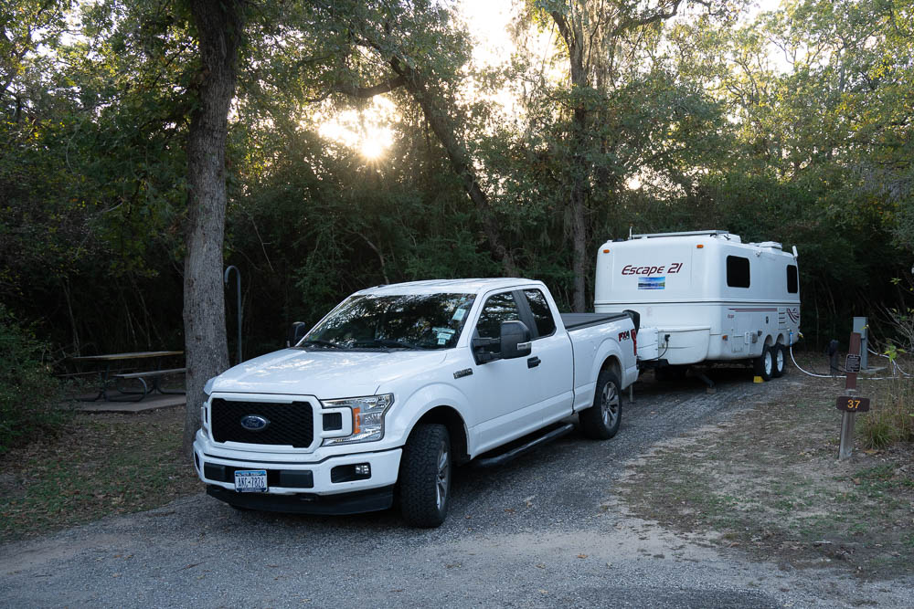 Mostly 2 lane roads including TX 63, US 190 & TX 21. Lots of passing sections so I never felt like my 65MPH was holding anyone up (most speed limits were 70MPH). I stopped in the Huntsville Walmart, an easy off the main route. Quite a bit of traffic in College Station but not as bad as the time I went through it during what I suspect was a football game. In any case I arrived at Lake Somerville State Park around 3:00, stopped in the office to get my window tag, then headed to Post Oak site 37. Directly across from the bathrooms, a back in site on asphalt deep enough for the trailer & truck with water & electric for $20.00 per night plus a $5.00 per day park fee for a total of $75.00. No reservation fee. Needed 1" side to side and the tongue lifted by 7". I had to unhook anyway because I have a Friday appointment for a haircut & beard trim in Somerville. Lots of trees & brush between sites - you can't see your neighbor (if there were any - the campground has 60 sites and there are only about 6 of us here).