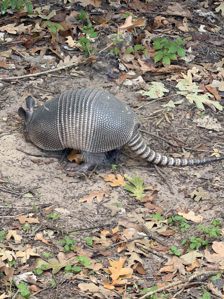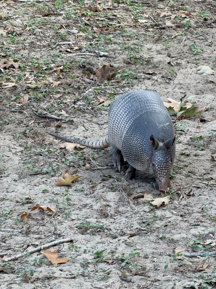 While cool this morning, it is warming up, 75°F at 1:00. So far the MAXX fan is keeping the trailer livable but it it gets much warmer inside I'll have to run the AC to keep my medicine under 80F. I moved outside to read. While reading an armadillo came by for a visit. Kind of neat; you don't see too many of them in upstate NY, but they go along with the turkey vultures for appeal. I also found some of the purple berries that I only seem to find here in Texas.