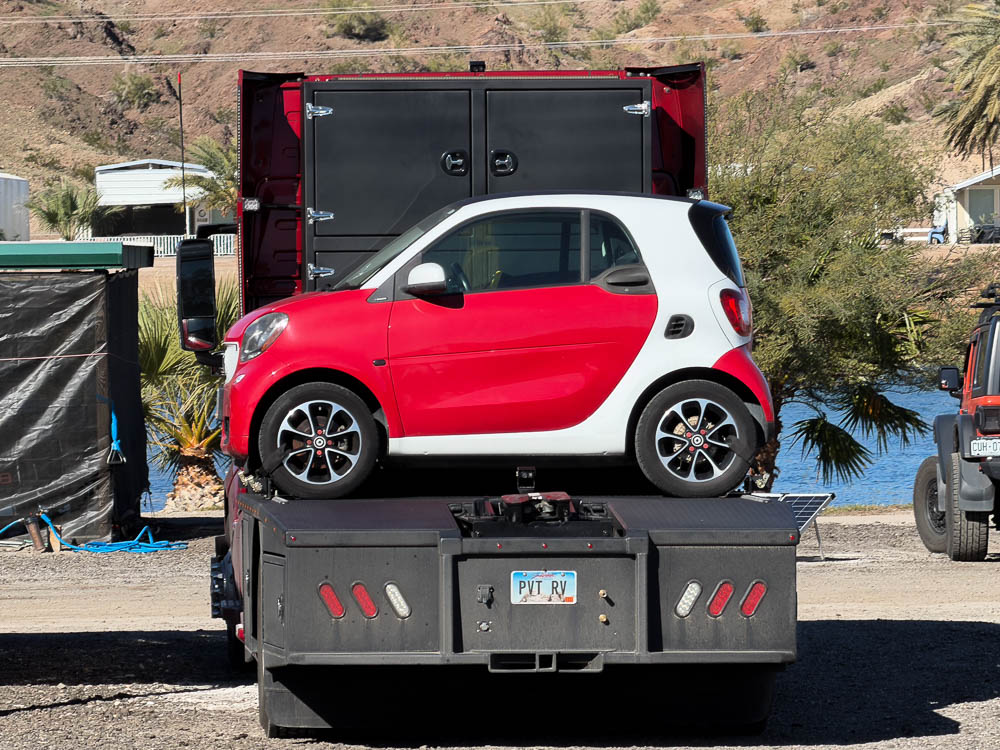 Back at my trailer I started making reservations for next winter. A large 4 slide 5th wheel moved in behind me. While my trailer might be one of the smallest, he has one of the smallest cars. Of course it is sitting on the back of his tow vehicle: