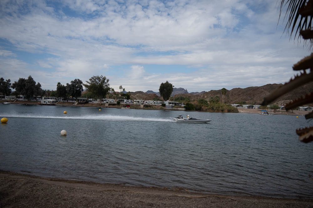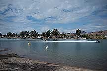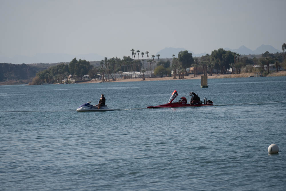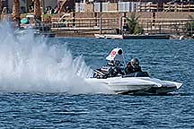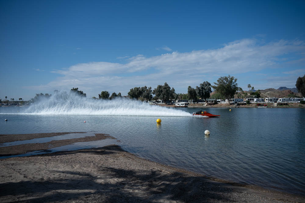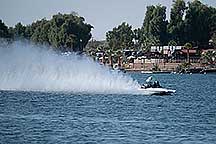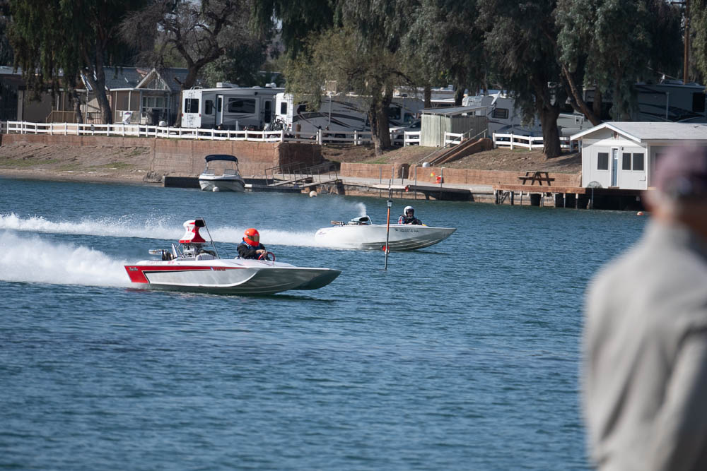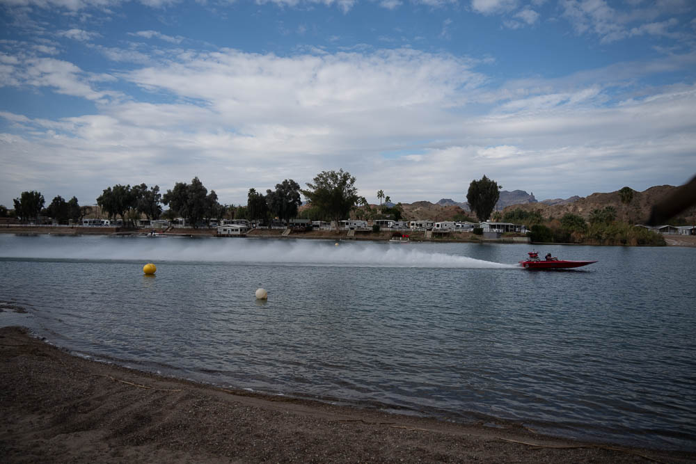 Around noon I walked back to the Pirates Den park (south of the La Paz park & the location of the Black Pearl Restaurant) to watch some of the qualifying runs of some of the boats. Sort of like watching paint dry - a long time between runs, but I stayed for a few photos. While the boats sometimes get as far up the river as my trailer, they are coasting by then. The start is at the restaurant, and the length of a run is 660', 1000' or 1320' depending on class. It looks like they are doing the shortest run today since I was well into the Pirates Den park to take these photos & for most of them I was at the finish line.