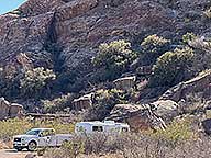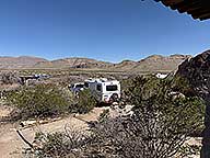I'm in Site 2, a back in level side to side but needing 4 1/2" up on the tongue. I had to unhook to raise it that much. The site is a mix of asphalt & desert sand with 2 tent pads and a covered picnic table. Water & electric for $16.00 per night plus a $7.00 daily entry fee.