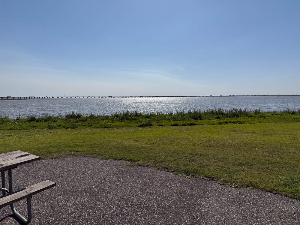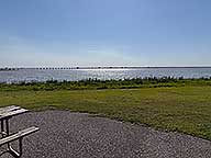 I'm in site 25, a full hookup back in site looking out over the bay. The site is on asphalt, with a picnic table & charcoal grill and is close to the bathrooms. I'm here for 3 nights with a base charge of $46.00 per night. With reservation fee & taxes it comes to $51.55 per night. While there are some pine trees on the north side of the site, little shade. There is traffic noise from the I 10 causeway to the south and if you are on the northern side of the park, traffic noise from US 90. When sitting outside at site 25 the noise from I 10, even though it is all the way across the bay, is loud. There is something to be said about the fact that sound travels easier over water. It is louder than the traffic noise along side I 10 out west where it is a 10th of the distance away.