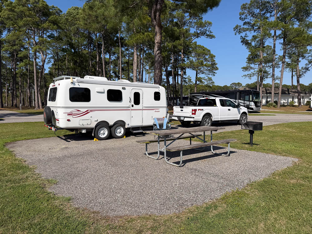 Other than the first couple on miles which were on narrow Louisiana parish roads, the trip was on I 12 & I 10. The traffic was heavy around Biloxi and Mobile. I stopped for gas at Loves #846 ($3.34) & a Berryland Camper store where I paid way too much for a Camco LP adapter hose. I arrived at the park at 2:10.