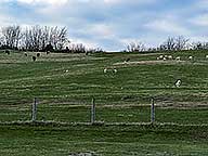 The cows are all lying down in the field behind me. On the hill in front is a herd of sheep and a few more cows:
